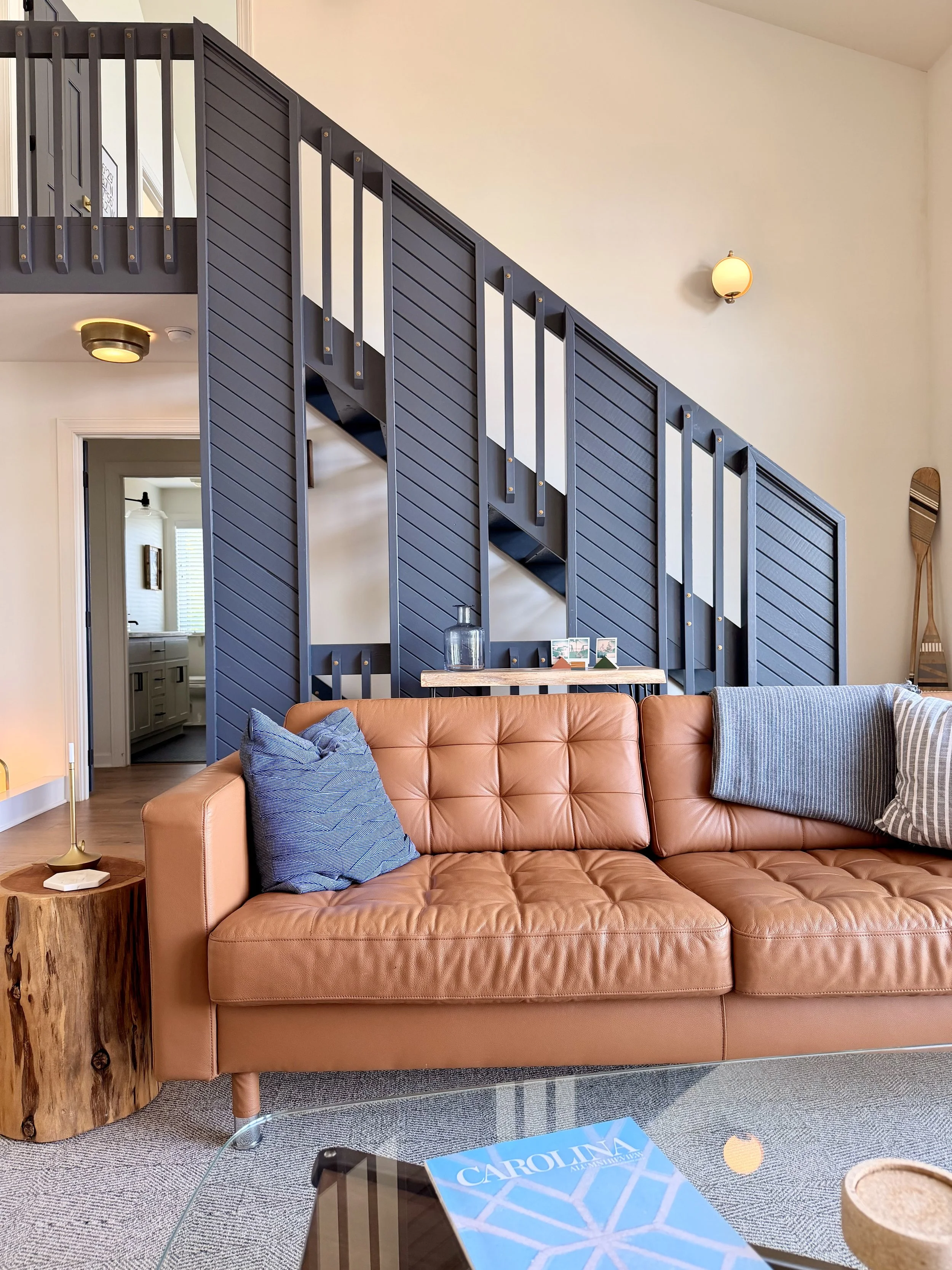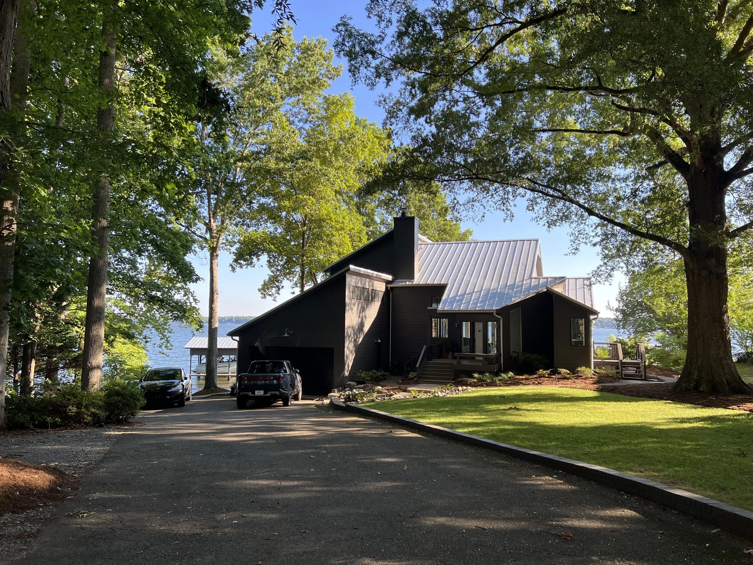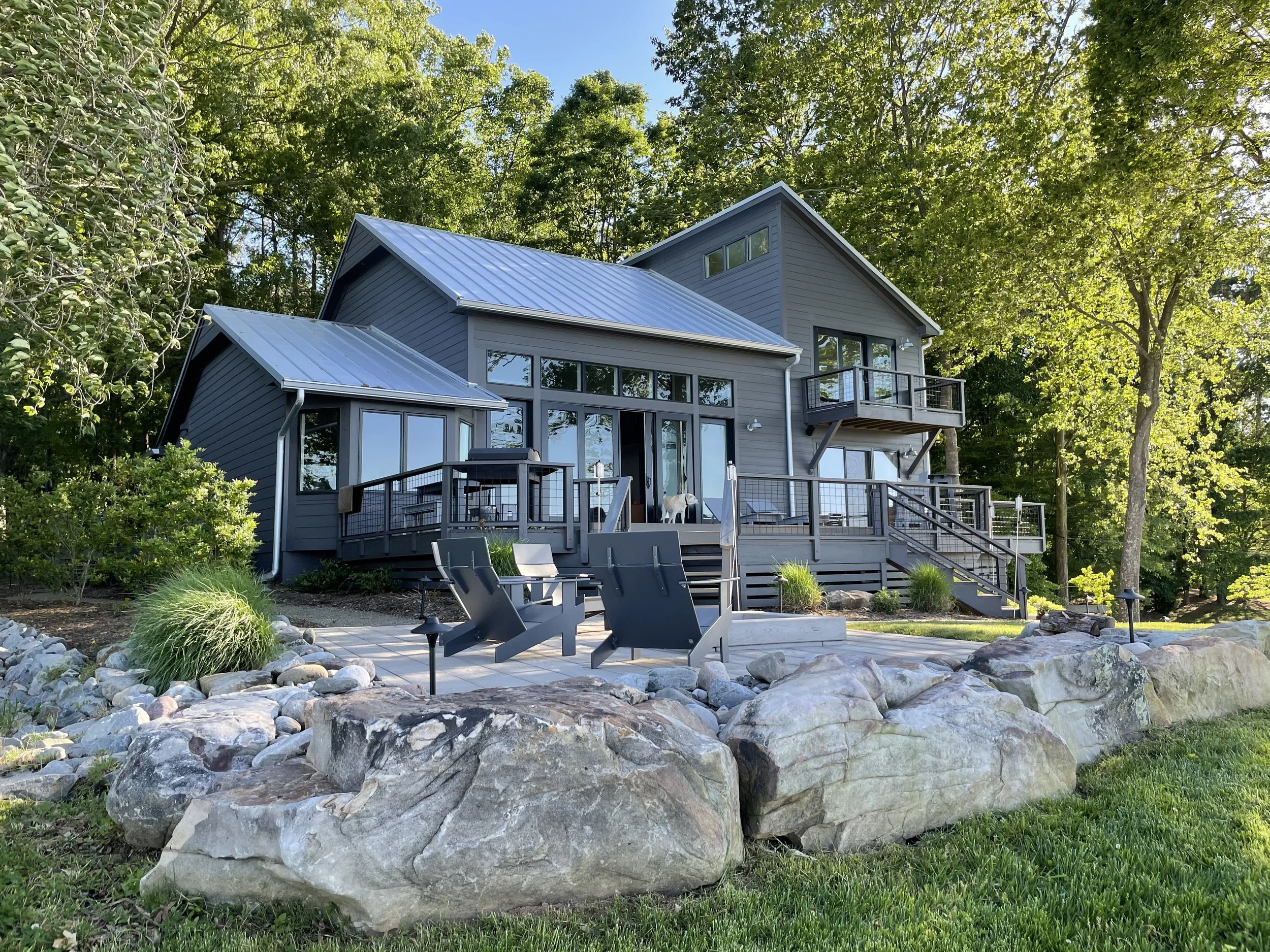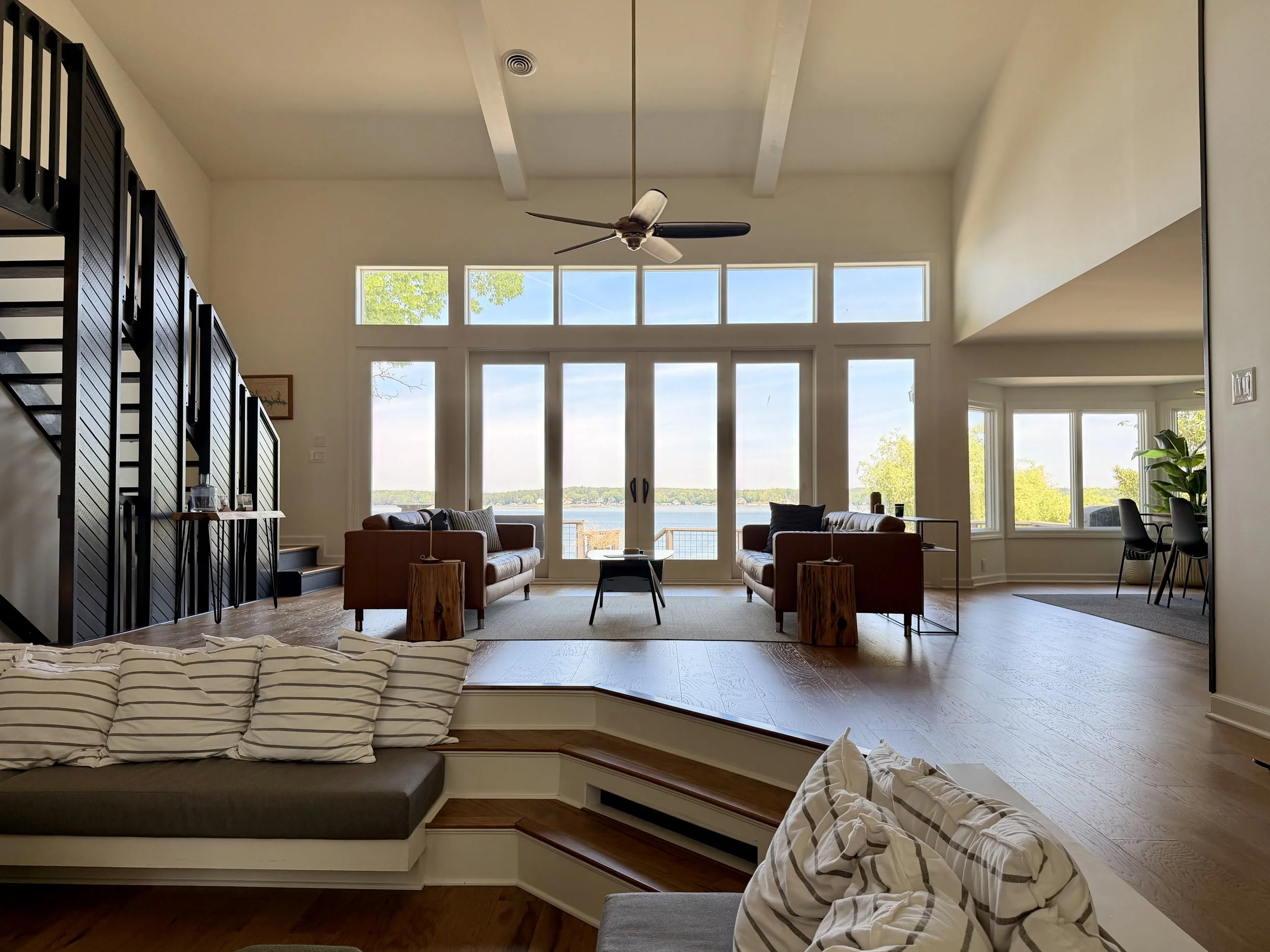 The design balances a striking architectural silhouette with the warmth of an established home. Large-scale windows and vaulted ceilings ensure the lake is visible from nearly every corner of the house.